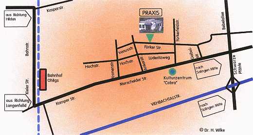 Aus Solingen Mitte kommend erreichen Sie über die Beethovenstrasse, die in die Merscheider Strasse übergeht, links das Kulturzentrum "Cobra" und biegen rechts am "Autohaus Vonkeitz" in die Fürkerfeldstrasse ein. An der Kreuzung biegen Sie nun links in die Fürker Strasse ab; die Praxis liegt bald darauf an der rechten Seite.
